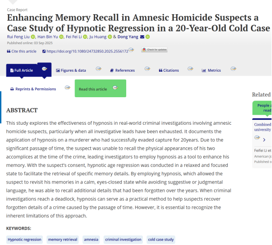 刘瑞峰博士在SSCI期刊《Journal of Forensic Psychology Research and Practice》发文揭示催眠回溯技术在刑事侦查中的突破性应用 ——助力20年悬案