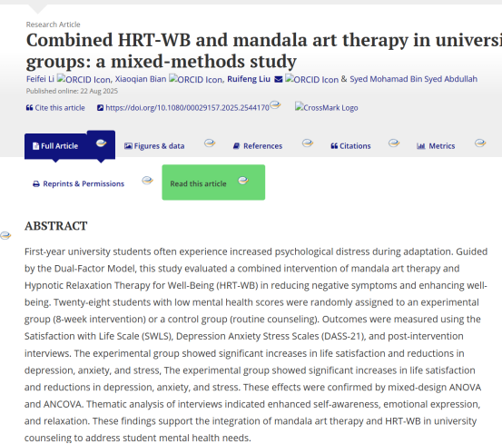 ——刘瑞峰博士团队在SSCI期刊《American Journal of Clinical Hypnosis》发表创新研究:“大学团体中系统式催眠放松疗法与曼陀罗艺术疗法联合干预:一项混合方法研究”“Combined HRT-WB and ···