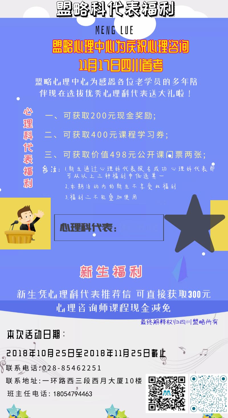 凡在2018年10月26日至2018年11月25日期间通过四川盟略心理科代表报名参加《心理咨询现场班》的,新生凭科代表的推荐信可直接获得300元《心理咨询现场班》课程现金减免。